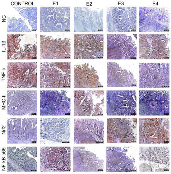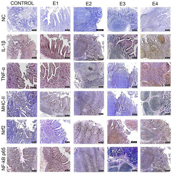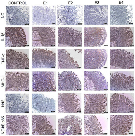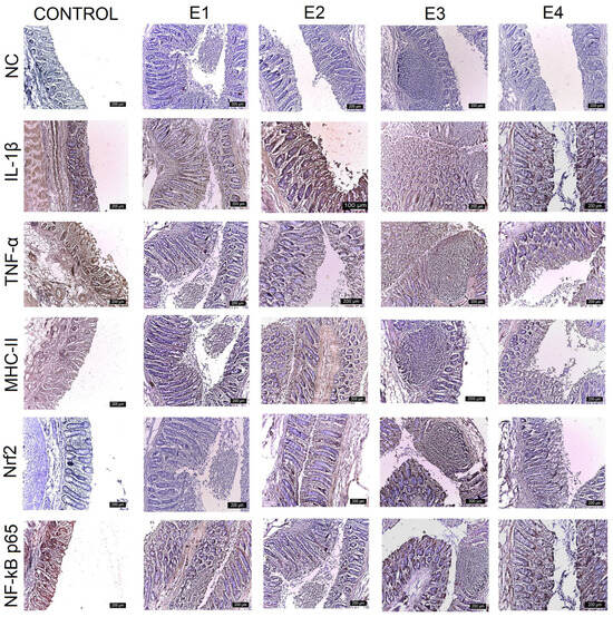 Immunohistochemical analysis of IL-1β, TNF-α, MHC-II, NF-kB p65, and Nrf2 in the jejunum. The expression of pro-inflammatory markers is evident in the epithelium and lamina propria cells of the jejunum for the control and E1, and progressively decreased for E2, E4, and E3. Nrf2 expression exhibited the reverse evolution. The most intense labeling is observed for E3, followed by E2 and E4. The expression for E1 and the control decreased to zero. Scale bar is 200 μm.