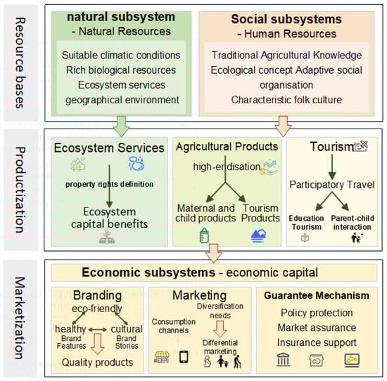 The commercialization of the resource basis for EPAHS essentially involves deeply exploring and innovatively transforming unique resources to turn traditional agricultural products into diversified, cross-sectoral products. This transformation process depends on the collaboration of the natural, social, and economic subsystems, highlighting the uniqueness of EPAHS.