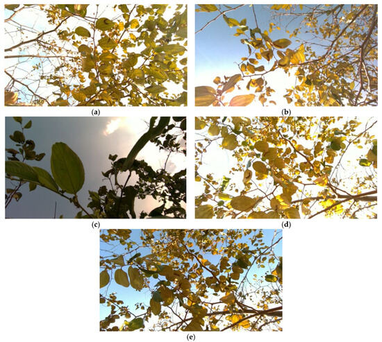 Additionally, the ROI feature available on the RealSense camera was utilized to focus on the leaves where the caterpillars were likely to be found rather than on the sky or background elements that could skew the exposure and white balance settings. This focus ensured that the captured images were of high quality and relevant to the detection task. By optimizing these parameters, we ensured that the camera could capture high-quality images under varying weather conditions, which is critical for accurate caterpillar detection and tracking. This parameter selection process is an important step in developing a reliable pest management system that can operate effectively in real orchard environments. The resulting images from these varying conditions are shown in Figure 1a–e.