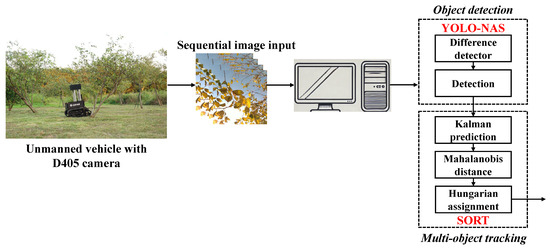 Our study also highlighted that all detectors are prone to missing detections due to occlusions or changes in lighting caused by external factors such as cloudy weather and wind. Nguyen et al. [34] discussed in his study how an additional Kalman filter along with deep learning algorithm for camshift human tracking improved the overall accuracy of this robust system, as it can deal with the occlusions and missing detections, as mentioned above. To address these challenges and enhance the overall detection rate, we integrated the detectors with the SORT tracking algorithm [25], which provides an optimal balance between computational speed and tracking accuracy. While more advanced trackers are available, we selected SORT for its simplicity and efficiency. SORT is particularly known for its speed, leveraging the Kalman filter for motion prediction and the Hungarian algorithm for data association. Although it is less robust to occlusions and complex motion patterns, its efficiency makes SORT especially well-suited for real-time applications where minimizing computational overhead is crucial. Also, standalone YOLO-NAS and YOLO-NAS plus SORT were compared by studying the parameters, namely true positive detections and false positive detections for the caterpillars in the test video taken at the distance of 20–25 cm and 30–35 cm. Figure 2 presents a schematic diagram of the YOLO-NAS combined with the SORT algorithm with the UGV.