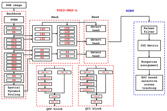 YOLO-NAS-L plus SORT with selective corner tracking network architecture.