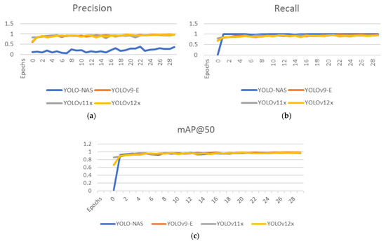 (a–c) depicts the precision, recall, and the mAP@50 values for the YOLO models.