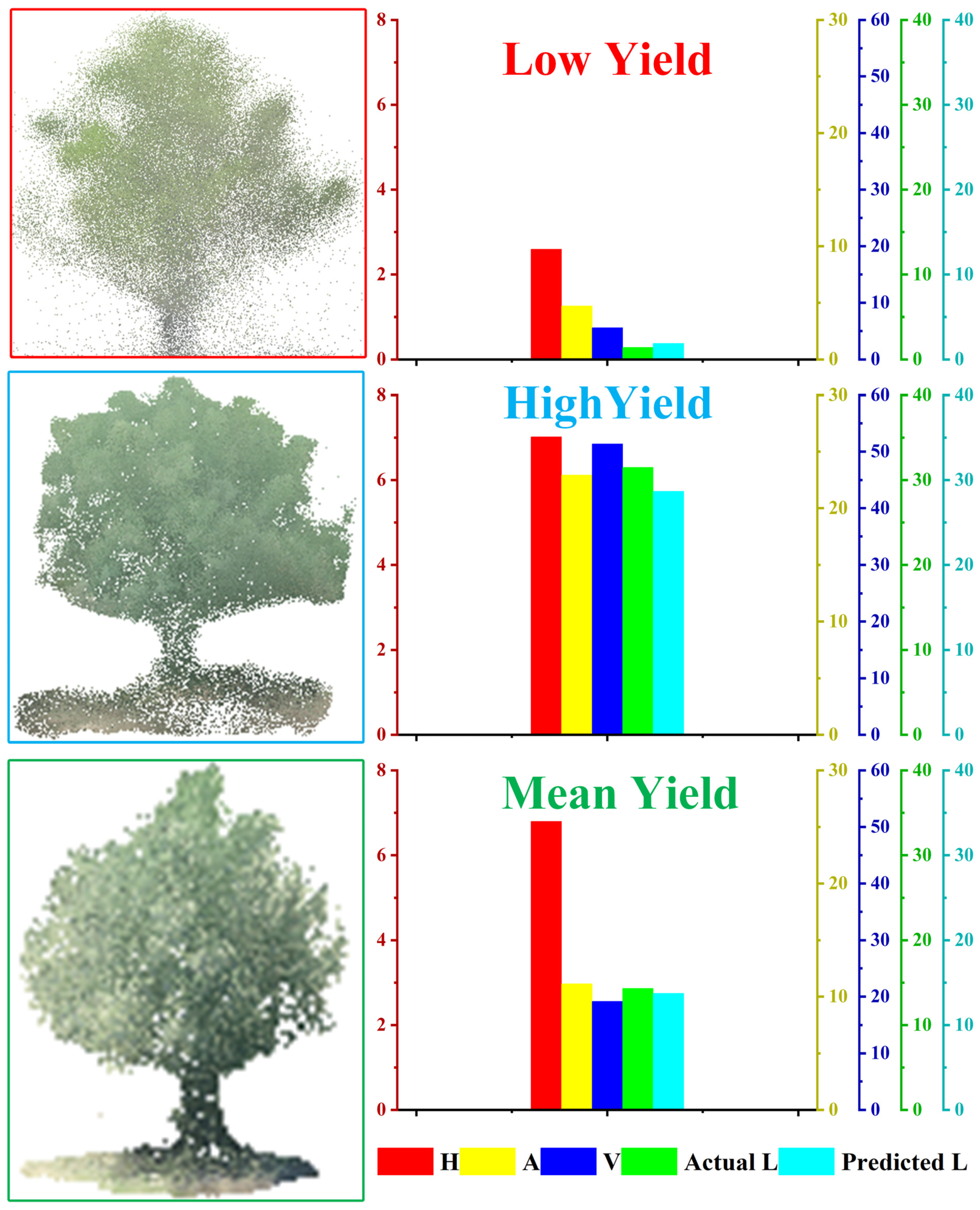 Figure 10. The characteristic parameters of walnut trees with low yield, high yield, and average yield and the comparison of yield predicted by the random forest model with actual yield. H, A, V, and L represent the tree height, crown projection area, volume, and yield of walnut, respectively.