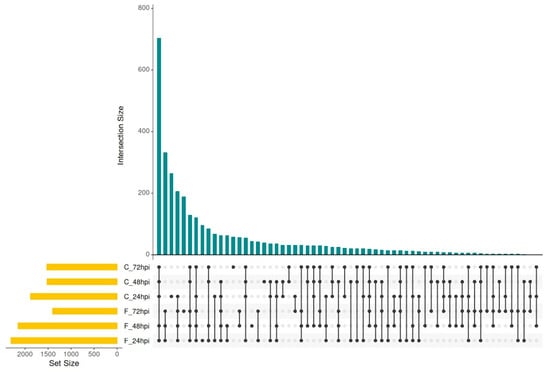 Upset plot of uniquely expressed differential expression analysis of the European plum cv. Victoria at 24, 48, and 72 hpi of Monilinia fructigena. Control samples: C_24, C_48, and C_72; inoculated fruit samples: F_24, F_48, and F_72.
