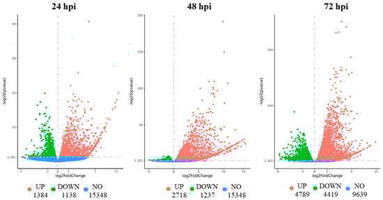 The distribution of differentially expressed genes (DEGs) in the European plum inoculated with M. fructigena (F_24, F_48, and F_72) in comparison with the control (C_24, C_48, and C_72). p value ≤ 0.05, |log2FoldChange| ≥ 0.