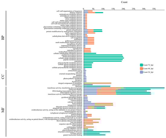 Characteristics of the European plum DEGs based on Gene Ontology (GO) categorization in response to M fructigena inoculation at 24, 48, and 72 hpi. BP—biological processes; CC—cellular components; and MF—molecular functions.