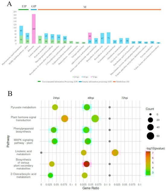 Kyoto Encyclopedia of Genes and Genomes (KEGG) pathway enrichment analysis of all genes in response to M. fructigena throughout 24, 48, and 72 h post inoculation (hpi). (A) KEGG pathways were assigned to 3 categories (only statistically significant (pad < 0.05) changes were depicted). (B) Commonly expressed pathways enrichment.