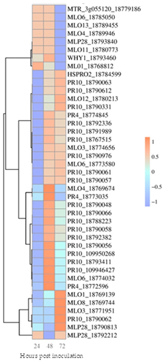 During the interaction with the pathogen, 41 DEGs were involved in the defense response over the time period, according to functional GO enrichment analysis (Table S3). The expression levels of DEGs are shown in the heatmap (Figure 5). DEGs are involved in response to M. fructigena encode pathogenesis-related (PR) proteins, mildew resistance locus O (MLO-like) proteins, single-stranded DNA-binding protein, nematode resistance protein-like, and phytohormone-binding protein.