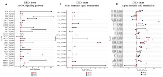DEGs involved in significantly enriched MAPK signaling pathway (A), plant hormone signal transduction (B), and alpha-linolenic acid metabolism (C) KEGG pathways, associated with infection, throughout 24, 48, and 72 hpi. Only statistically significant (padj < 0.05) changes are depicted.