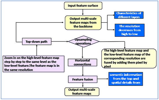 The feature pyramid network (FPN) is a technology focusing on multi-scale feature fusion, which can significantly improve the detection capability of small targets. Its core idea is to build a top-down feature pyramid, transfer the semantic information of high-level features to the bottom layer, and combine the details of low-level features, to realize the comprehensive utilization of multi-scale features [22,23]. The workflow of the FPN consists of two main steps, as shown in Figure 1.