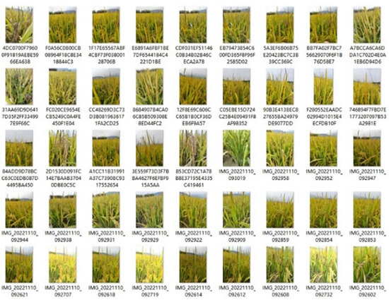 In order to test the performance of the UAV-mounted image information acquisition method for the middle and lower parts of rice, two varieties of rice, Huangguang Youzhan (hybrid rice), were used in the experiment. The test time was October 14, 2022, and the rice growth period was the full ear stage. The field test area was adopted, the plant row spacing was 6.5 × 7.6 cm, and the planting area was 12 × 4.5 m. This region was divided into 18 plots, with 9 plots for each rice variety, including the test group and control group (each with a size of 3 × 3 m). Crop parameters are shown in Table 1.