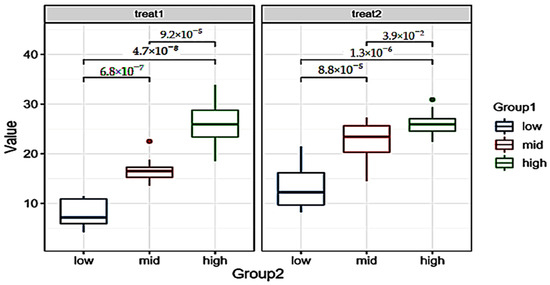 The data analysis (as shown in Figure 4) revealed that in both treatment groups (treat1 and treat2), the detection values progressively increased from low to mid to high levels as the degree of treatment intensity escalated (Group 1). Notably, the detection values for the treat2 group were consistently higher than those for the treat1 group, indicating a more pronounced detection effect. Specifically, at the low level, treat1 exhibited a more concentrated distribution of values between 8 and 11, whereas treat2 showed a slightly higher distribution of values ranging from 12 to 16. At the mid level, the detection values for treat1 and treat2 rose to the ranges of 18–21 and 22–25, respectively, demonstrating a significant improvement in detection performance for both groups in this stage. At the high level, treat1 had a value distribution of 27–32, while treat2 exhibited a further distribution of 29–33, albeit with a slight increase in variability, suggesting some fluctuations within the internal data. As shown in Figure 4, the red dots represent outliers and the green dots in the graph represent target values or expected thresholds.