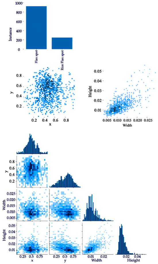 The label distribution shown in Figure 5 reveals a significant feature: the height and width of the detection target frame are, almost without exception, less than 0.1 relative to the size of the image, and the target objects processed in most cases belong to the category of small targets. Specifically, since the target entities such as the black spots of rice disease in the test data set show significant small-scale features visually, their tiny size not only increases the difficulty of target detection compared with the background or other environmental factors, but may also cause the model to be susceptible to noise interference, edge blurring, shape similarity confusion, and other problems in the recognition process.
