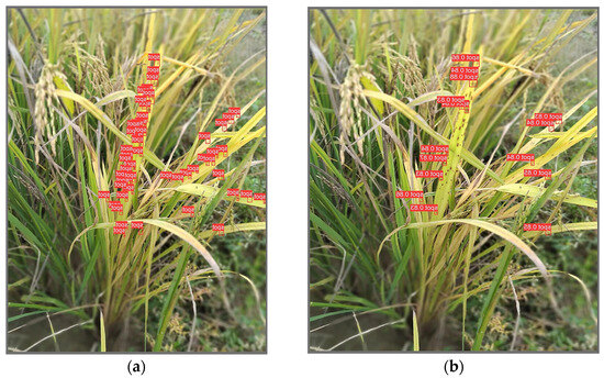 The experiment adopted label pictures with manual labels as a reference to visually demonstrate the implementation effect of the YOLOv8s model in the detection task of flax spot disease. Figure 8 shows the detection results after YOLOv8-EDCA processing.