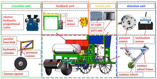 The detection unit is located at the front of the planter. The pressure sensor and inclination sensor are mounted on the profiling wheel frame, with the profiling wheel at the bottom of the frame. The PLC and HMI are installed in an easily accessible position, and the power module is placed near the PLC. The execution unit is positioned in the middle of the planter. The electro-hydraulic proportional valve, hydraulic cylinder, and parallel four-bar linkage are located at the front of the seed box. The furrow opener is placed at the bottom of the execution unit. The hardware parameters of the control system are listed in Table 3.