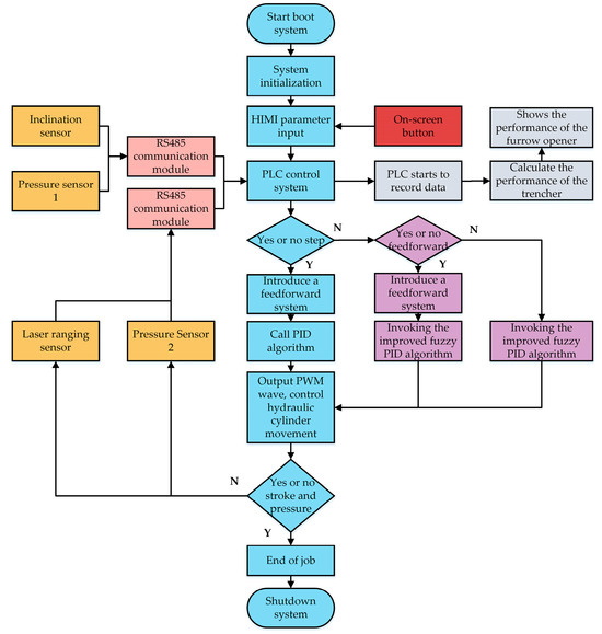 The software of the peanut planter’s sowing depth control system includes data acquisition, processing, control algorithm, and human–machine interaction modules. The data acquisition module reads data from pressure sensors, inclination sensors, and laser sensors via RS485 and analog interfaces. The data processing module filters, calibrates, and calculates height differences. The control algorithm module employs a DLF-Fuzzy PID (double-loop feedback fuzzy PID) strategy to dynamically adjust PID parameters and output PWM signals to control the electro-hydraulic proportional valve. The execution control module drives the hydraulic cylinder to adjust the furrow opener depth. The human–machine interaction module enables parameter setting, status display, and fault alarm through the HMI. All modules work together to ensure precise sowing depth control. The system is programmed using Portal v16 software, with a workflow including initialization, main loop (data acquisition, processing, and control execution), and fault handling (anomaly detection and alarm).