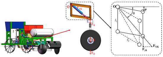 In Figure 4, FYK is the downforce of the hydraulic cylinder on the parallel four-bar linkage rod, N; Fyk is the hydraulic cylinder in the vertical direction component of N; G is the gravity of the floating part, N; φ is the swinging angle of the four-bar connecting rod, °; and θ is the angle of swing of the hydraulic cylinder, °.