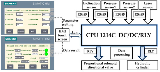 The pressure sensor and inclination sensor communicate with the PLC via RS485, transmitting ground height data in real time. The PLC calculates height differences and outputs PWM signals to control the electro-hydraulic proportional valve. This drives the hydraulic cylinder to adjust the parallel four-bar linkage, changing the furrow opener depth. The HMI connects to the PLC via Ethernet for parameter setting and status monitoring. The laser sensor measures ground height and provides the difference between the execution and detection units. The hardware connection diagram is shown in Figure 5.