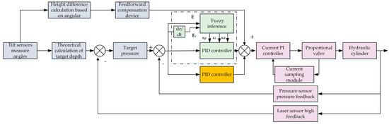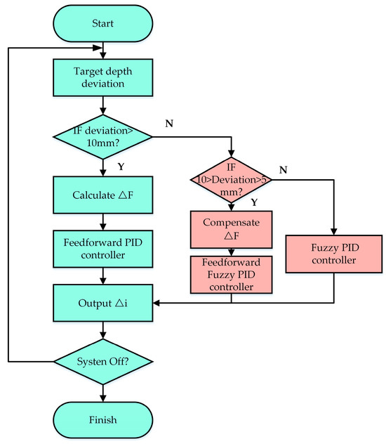 DLF-Fuzzy PID combines the advantages of fuzzy PID [29,30] control and conventional PID control, ensuring real-time performance and accuracy through double-loop feedback. When a step change in target depth occurs, the system automatically switches to conventional PID control to avoid overshoot caused by fuzzy PID control. During stable target depth conditions, fuzzy PID control is employed to enhance dynamic response and steady-state precision. Additionally, feedforward control is introduced during step changes to further reduce response time and steady-state error. The depth control program diagram is shown in Figure 6.