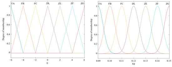 In this study, the triangular affiliation function is selected for input variables and the Gaussian-type affiliation function is selected for output variables. The fuzzy controller is of the Mamdani type. Its membership function is shown in Figure 7.