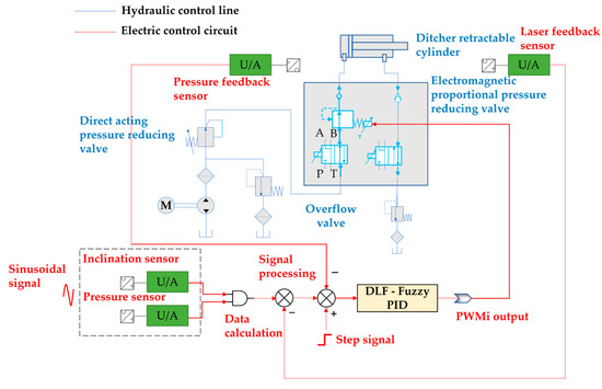 To validate the algorithm’s advantages, simulation models of double-loop feedback fuzzy PID (DLF-Fuzzy PID), traditional PID, and fuzzy PID control were developed in Matlab-R2020b/Simulink, with a hydraulic simulation model created in Amesim-2020.2 for co-simulation (Figure 9).