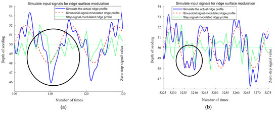 A co-simulation was conducted 8000 times, with Figure 10a,b presenting partial magnified views of input simulation signals from representative cases. Figure 10a illustrates scenarios with significant differentials between two measurement points on the ridge surface, while Figure 10b demonstrates minimal differentials corresponding to smoother ridge profiles. To validate control performance under both flat and undulating ridge conditions, Figure 10c,d comparatively present results from conventional PID, Fuzzy PID, and the proposed double-loop feedback Fuzzy PID control methods. All three control strategies exhibit adaptive parameter adjustment capabilities in response to ridge profile variations.