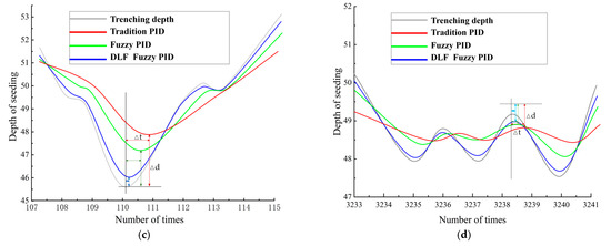 During sudden ridge deformation, all strategies demonstrate comparable response times with significant parameter adjustments yet exhibit substantial accuracy discrepancies. Under stable ridge conditions, improved tracking accuracy correlates with prolonged response times across the control schemes. The parameter Δt denotes the deviation between the algorithm’s response time and the prescribed standard duration, reflecting system responsiveness. Δd represents the discrepancy between actual actuator adjustment depth and theoretical requirements, indicating control accuracy and tracking performance. Under operational parameters of 3 km/h sowing speed and 50 mm target depth, the enhanced DLF Fuzzy PID algorithm demonstrates marked improvements in both response speed and control accuracy compared to conventional PID and standard Fuzzy PID implementations. It enhances dynamic performance and stability, making it more suitable for high-precision sowing operations.