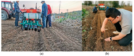 To verify the performance of the peanut planter with a dynamic sowing depth control system, field tests were conducted using the 2MB-1/2 peanut planter manufactured by Shandong Yuanquan Machinery Co., Ltd. (Yishui County, Linyi City, China). The tests used Luhua peanut seeds and were carried out in May 2023 in Zhujiazhuang Village, northwest of Yishui County, Linyi City, Shandong Province. The test plot measured 100 m in length and 40 m in width, with soil primarily consisting of cinnamon soil (brown earth) characterized by a loam or light loam texture, which had undergone rotary tillage treatment. The field trial is shown in Figure 11.