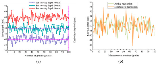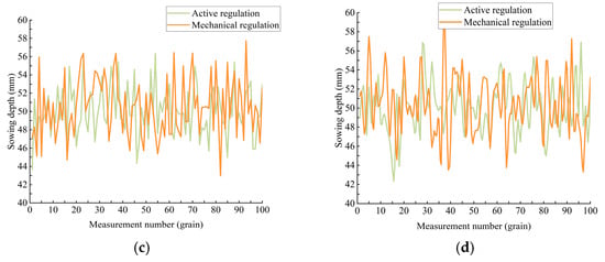Experimental data. (a) When the speed is 3 km/h, the field data of active adjustment methods with different sowing depths are set. (b) The field data of two adjustment methods when the sowing depth is set to 50 mm at a speed of 3 km/h. (c) The field data of two adjustment methods when the sowing depth is set to 50 mm at a speed of 4 km/h. (d) The field data of two adjustment methods when the sowing depth is set to 50 mm at a speed of 5 km/h.