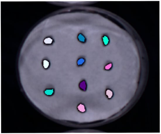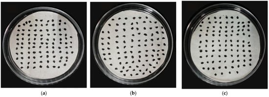 Ten seeds were grouped together and evenly placed on a petri dish lined with filter paper (Figure 2) for image acquisition, resulting in Vis-NIR (visible–near infrared) hyperspectral images of the seeds captured in reflectance mode.
