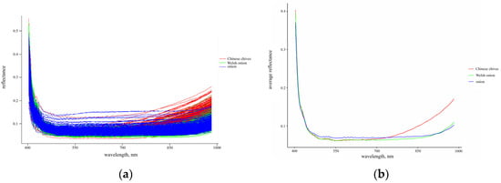 (a) Raw spectral curves of all seeds; (b) Average spectral curve of Welsh onion, onion, and Chinese chives seeds.