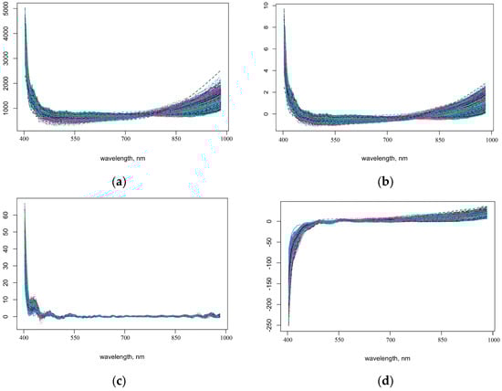 MSC employs a mathematical algorithm to separate the scattered light signal from the chemical absorption information in spectral data []. Initially, the “prospectr” data package was loaded into R 4.4.2 to input the original spectral data, consisting of 194 bands in the 400–1000 nm range. Subsequently, the average spectral reflectance (S) of all seeds was calculated using Equation (2):