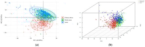 Figure 5a shows the two-dimensional scatter plots of the first two principal components derived from the seed spectral data. PCA results show that the cumulative contribution of PC1 and PC2 to the spectral data exceeds 90%, indicating that PC1 and PC2 account for the majority of the variables. The scatter plot displays varying degrees of clustering based on PC1 and PC2. However, some overlap is observed. Through the three-dimensional plot (Figure 5b), it becomes evident that despite the overlap between Welsh onion and onion, there are discernible distinctions along the PC3 dimension. These nuances allow for the differentiation of the three seed types based on their unique characteristics within this multi-dimensional space.