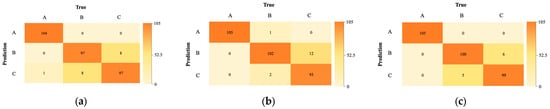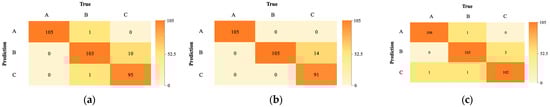 (a) Confusion matrix plot based on SD-KNN at 700–1000 nm; (b) confusion matrix plot based on SD-RF at 400–1000 nm; (c) confusion matrix plot based on Original-PLS-DA at 400–1000 nm.