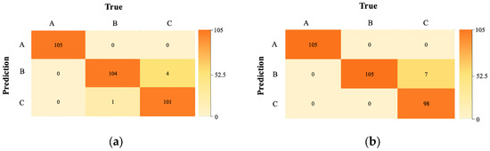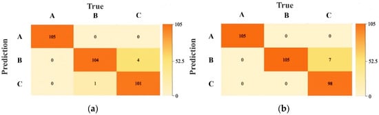Based on the results of the model’s confusion matrix (Figure 7), it can be concluded that the Original-Linear-SVM model (Figure 7a) and the FD-Linear-SVM model (Figure 7b) accurately classify Chinese chives seeds and Welsh onion seeds. Both models achieved 100% prediction precision for classifying Chinese chives seeds. For classifying Welsh onion seeds, the FD-Linear-SVM model exhibited higher prediction precision than the Original-Linear-SVM model; in classifying onion seeds, the Original-Linear-SVM model demonstrated higher prediction precision than the FD-Linear-SVM model.