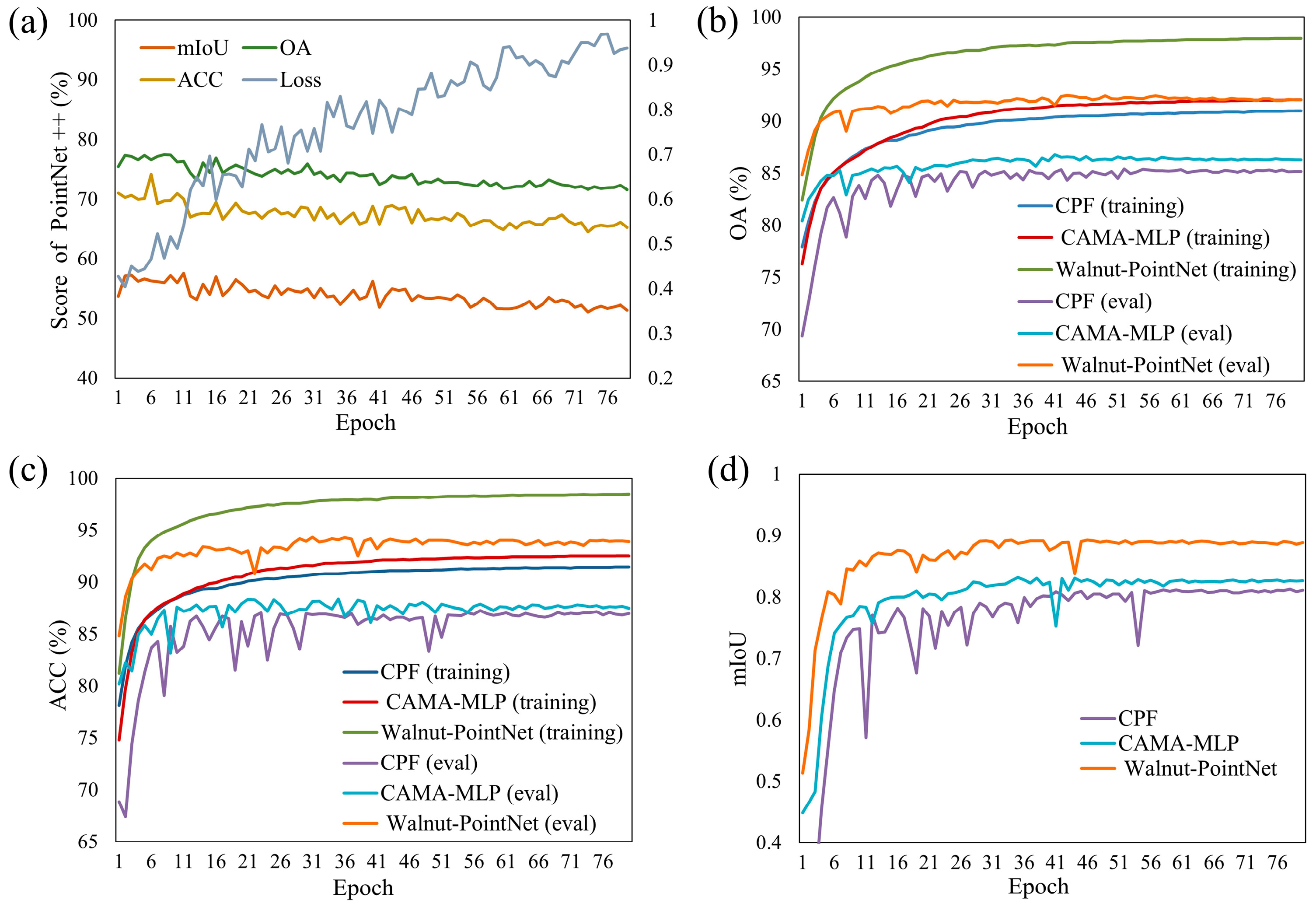 As an optimized version of the original PointNet++, an ablation study was conducted to validate the effectiveness of each component in the proposed optimization method. The study compared the performance of models with different components under the same experimental environment, including: (1) PointNet++ (baseline); (2) model with only CAMA-MLP; (3) model with only CPF; (4) Walnut-PointNet (ours). Figure 5a shows the training curve of PointNet++. The loss curve increased with the number of epochs, indicating overfitting during the training process. Additionally, its OA, ACC, and mIoU metrics fluctuated around lower values without significant improvement, suggesting that the model struggled to learn and generalize effectively to the walnut tree point cloud dataset, exhibiting poor adaptability. Figure 5b–d further compare the OA, ACC, and mIoU curves of different models during training and evaluation. Each component of CAMA-MLP and CPF individually improved the model’s performance. With the combined effect of CAMA-MLP and CPF, Walnut-PointNet significantly outperformed other models across all metrics, converging around 50 epochs, demonstrating faster convergence and greater stability.