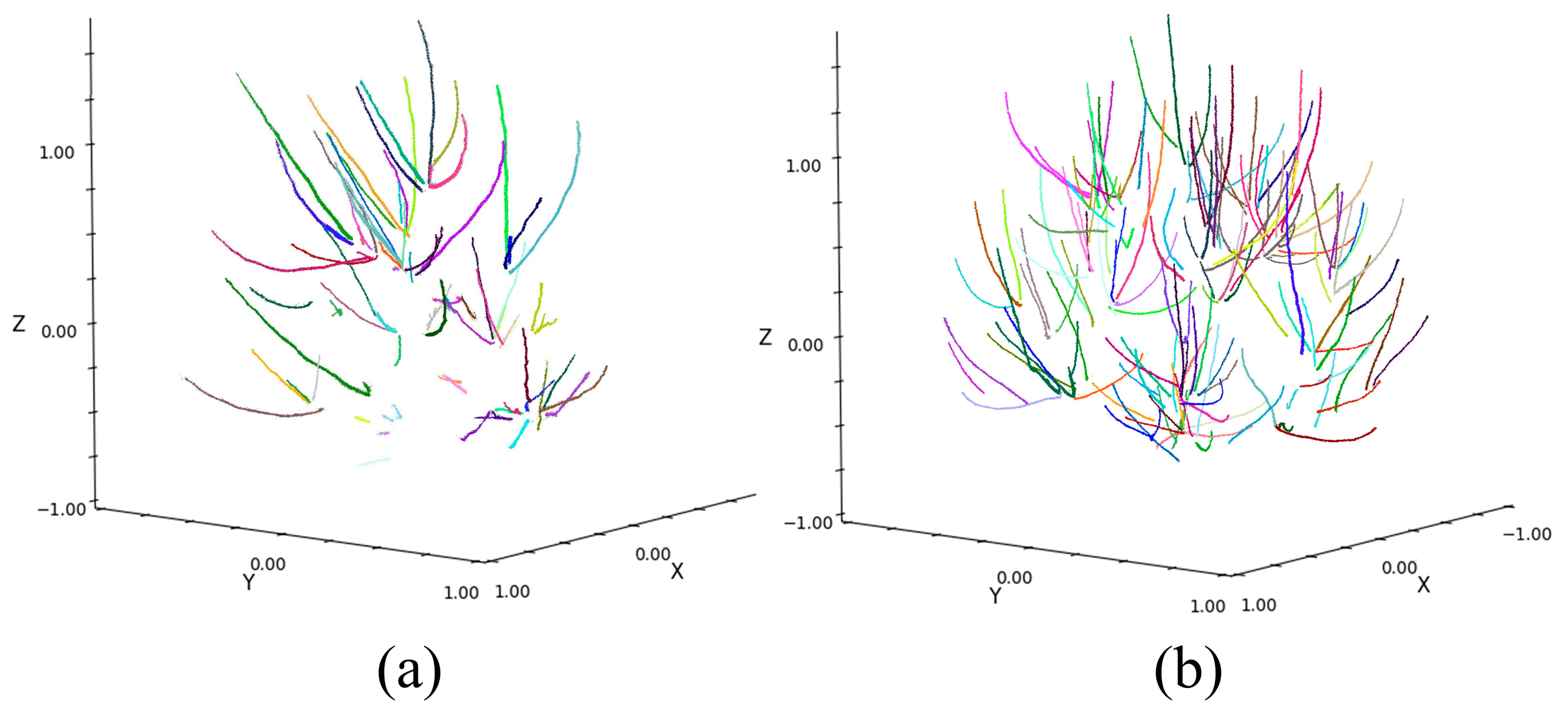 Clustering of walnut tree pruned branches. (a) Walnut tree with 65 branches (initial fruiting stage); (b) walnut tree with 158 branches (peak fruiting stage).