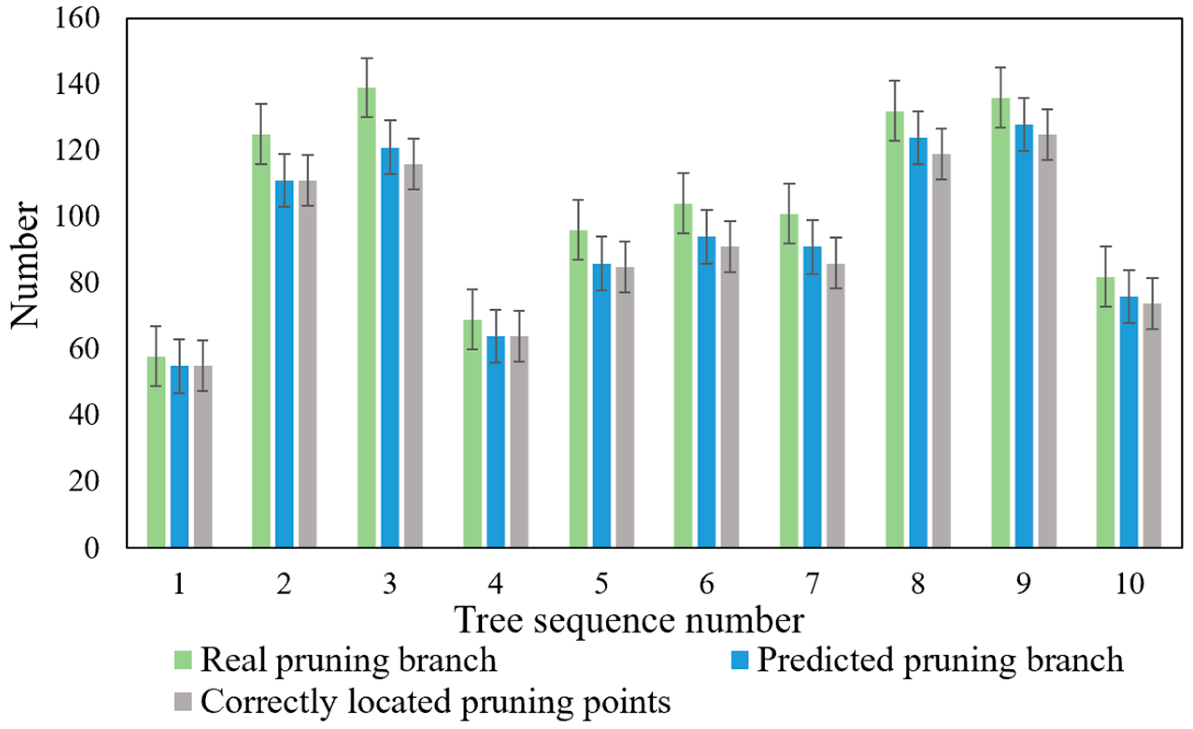 The study results revealed that the proposed method performed excellently in pruning branch identification and pruning point localization, demonstrating high accuracy. The following sections describe the effects of various factors on the results and the advantages and limitations of the method for practical applications.