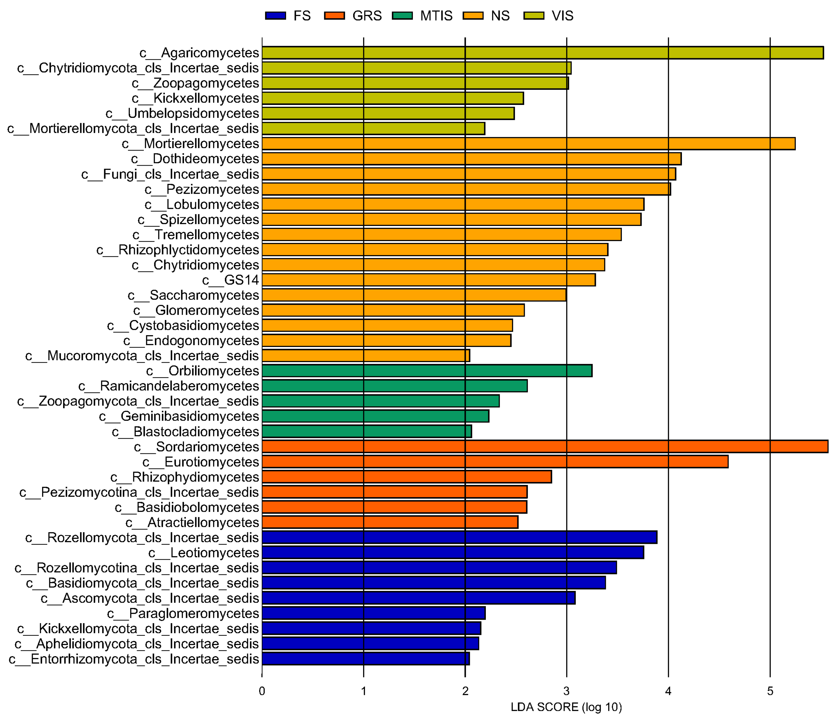 Ramicandelaberomycetes were the primary fungal classes responsible for the significant differences between the MTIS and the other soil samples. Finally, VIS was significantly differentiated from the other soil samples by