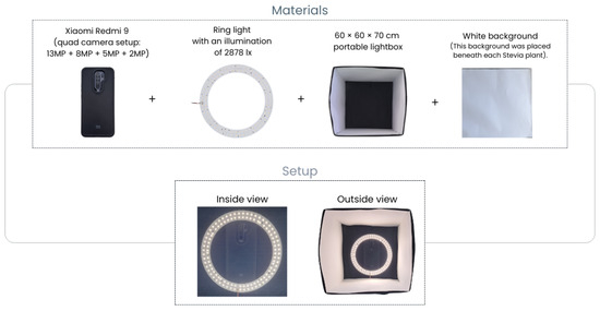 To ensure high-quality and consistent image capture, 150 images of Stevia crops were taken in a controlled environment using a 60 × 60 × 70 cm portable lightbox. A ceiling-mounted ring light provided uniform illumination at 2878 lux (symbol: lx), preventing shadows or variations in natural light that could interfere with the colorimetric analysis. The images were captured using a Xiaomi Redmi 9 smartphone (quad camera setup: 13 MP + 8 MP + 5 MP + 2 MP), which was positioned 30 cm above the lightbox opening at a 90-degree angle, ensuring a consistent height and angle across all samples.