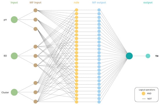 The proposed solution implements an NFS based on ANFIS architecture, combined with the grid partition method. As noted in Section 1, ANFIS is particularly effective when dealing with five or fewer independent variables. In this study, three variables were selected: soil pH, plant BD, and leaf colorimetry. These values were introduced into the NFS, which processed them through a combination of fuzzy inference rules and adaptive learning mechanisms inherent to ANFIS.