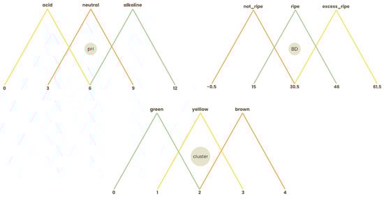 The FIS receives three input variables: BD, soil pH, and a variable derived from leaf colorimetry named Cluster. The ranges for the MFs of each input were established as follows: