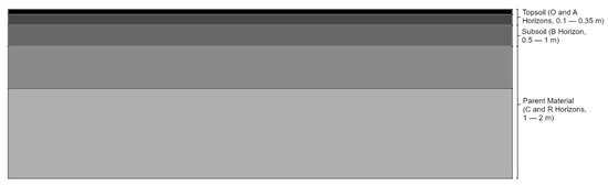 Agriculture depends fundamentally on healthy soils, a concept that remains a topic of discussion [40,41,42]. Healthy soil is generally defined as soil that is fit for purpose, including all necessary traits to support the proper development of plants and trees while maintaining conditions for soil fauna and microbial ecosystems [43,44,45,46,47,48]. It is composed of organic matter, minerals, water, air, and pores, organized in layers progressing from organic matter-rich material at the surface to more mineral-rich material at depth [49,50,51], as illustrated in Figure 1.