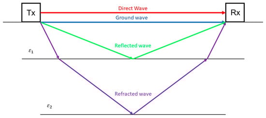 The operation of GPR relies on antennas that emit and receive EM waves in the form of wavelets with fixed amplitudes and central frequencies. Upon interacting with subsurface features, the transmitted waves change, including reflection, refraction, and attenuation, and are received as direct, ground, reflected, and refracted waves. The direct waves travel directly from the transmitter to the receiver and are first to arrive; ground waves are refracted waves at the surface and are second to arrive; the reflected waves are the waves reflected from layers or features in the subsurface and are last to arrive; the refracted waves are the waves that have gone through the process of refraction at depth (Figure 2). These wave modifications are recorded by the receiving antenna and subsequently analysed to infer subsurface properties [107,108,109].