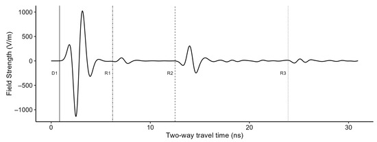 Ground-penetrating radar trace obtained from a synthetic model based on the typical soil profile seen in Figure 1, including the water table at the C Horizon. D1 is related to the direct wave measurement, and R1, R2, and R3 to the reflections off layers B, C, and R. Exponential gain was applied for the visualization of reflected waves. The simulation was performed using GPRMax (version 3.1, The University of Edinburgh/Northumbria University, Edinburgh/Newcastle, UK) [122].