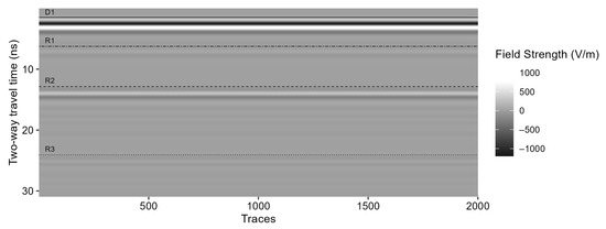 Radargram obtained from a synthetic model based on the typical soil profile seen in Figure 1, including the water table at the C Horizon. D1 is related to the direct wave measurement, and R1, R2, and R3 to the reflections off layers B, C, and R. Exponential gain was applied for the visualization of reflected waves. The simulation was performed using GPRMax (version 3.1, The University of Edinburgh/Northumbria University, Edinburgh/Newcastle, UK) [122].