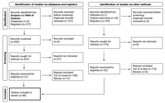 - Page, M.J.; Moher, D.; Bossuyt, P.M.; Boutron, I.; Hoffmann, T.C.; Mulrow, C.D.; Shamseer, L.; Tetzlaff, J.M.; Akl, E.A.; Brennan, S.E.; et al. PRISMA 2020 Explanation and Elaboration: Updated Guidance and Exemplars for Reporting Systematic Reviews. BMJ 2021, 372, n160. [Google Scholar] [CrossRef]