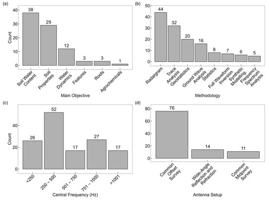 Regarding the frequencies used in agricultural GPR research, most studies operate within the 250–500 MHz range, balancing penetration depth and resolution for optimal subsurface characterization. Higher-frequency ranges (501–750 MHz, 751–1000 MHz, and >1001 MHz) are used in studies requiring finer spatial resolution, such as root detection and detailed structural analysis, whereas lower-frequency ranges (<250 MHz) are employed when deeper penetration is needed, such as in water table delineation and large-scale soil heterogeneity assessments (Figure 6c).