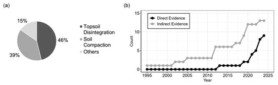 Distribution of studies per (a) soil degradation type and (b) temporal evolution of studies with indirect and direct evidence.