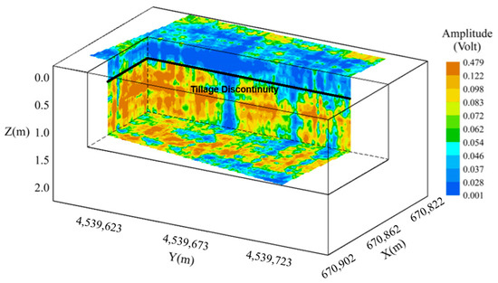 Benedetto et al. [149] applied multivariate kriging with external drift of EMI and GPR data to investigate clay variability at an experimental farm in Bari, Italy. The clay content varied from 30% to 85% in the upper layers and increased with depth. Block kriging interpolation of COS data acquired with central frequencies of 600 MHz and 1600 MHz showed lower reflection amplitudes in the tilled topsoil (<0.35 m) and higher amplitudes at the interface with the subsoil, suggesting that tillage had disrupted natural stratification, as observed in the previous studies (Figure 8). As for the main objective of the study, the authors concluded that due to soil complexity and small datasets and despite the multivariate approach, results were insufficient to fully characterize clay variability at the site but still highlight the need for a multisensory approach to improve soil structural assessments.